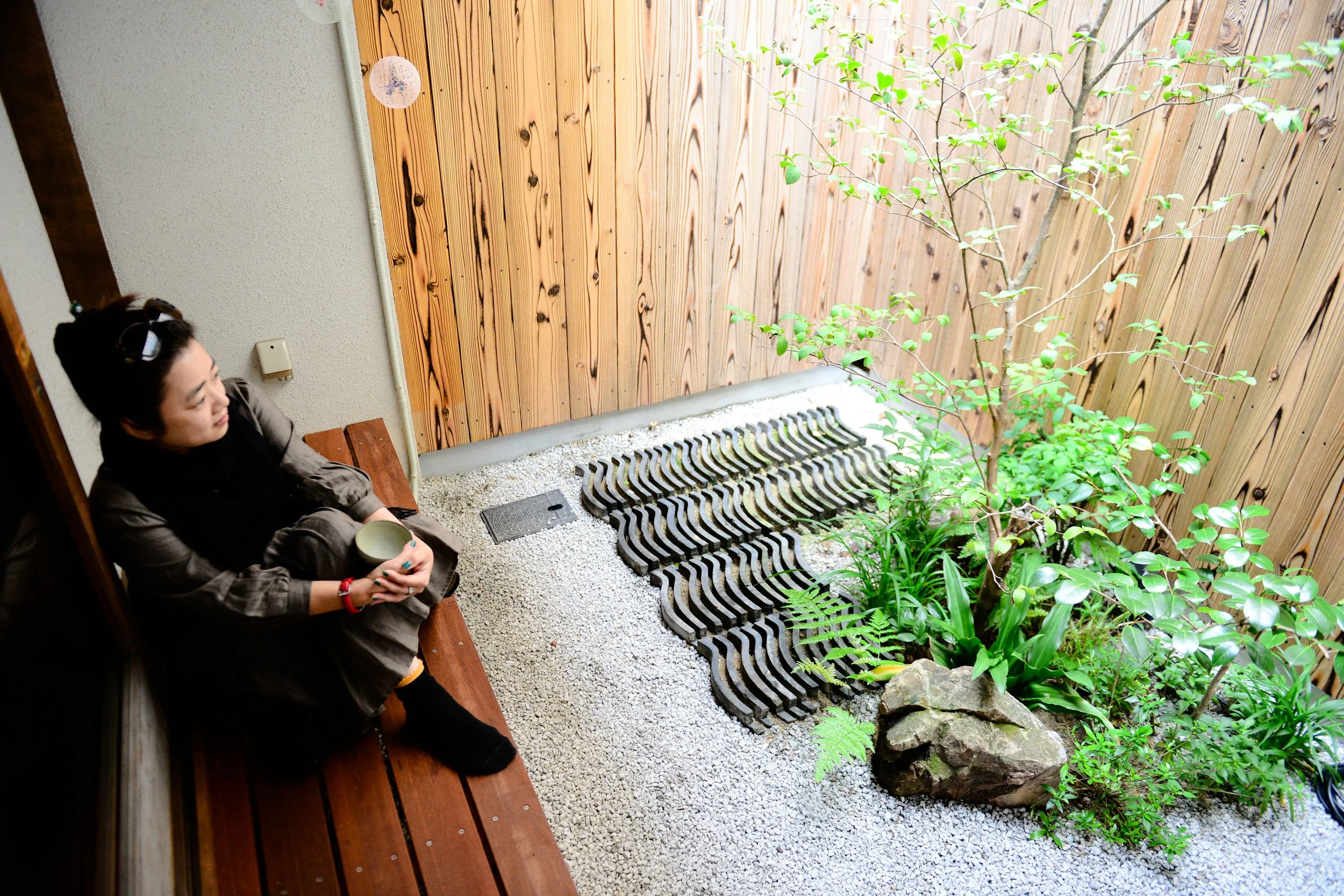 走過開放式廚房,拉開日式拉門,是以春樁為主視覺的日式庭院。晨間泡上一壺茶,坐在此,享受京都分明的四季變化